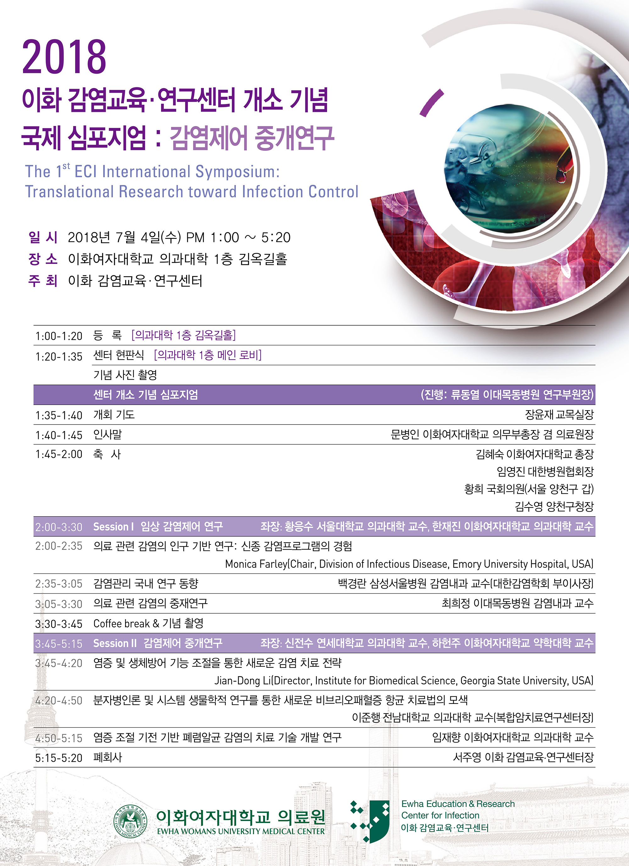 이번에 개최되는 이화 감염교육·연구센터 국제 심포지엄은 ‘감염 제어 중개 연구’를 주제로 7월 4일 오후 1시부터 5시 20분까지 이대목동병원 의학관 A동 김옥길홀에서 개최된다.
