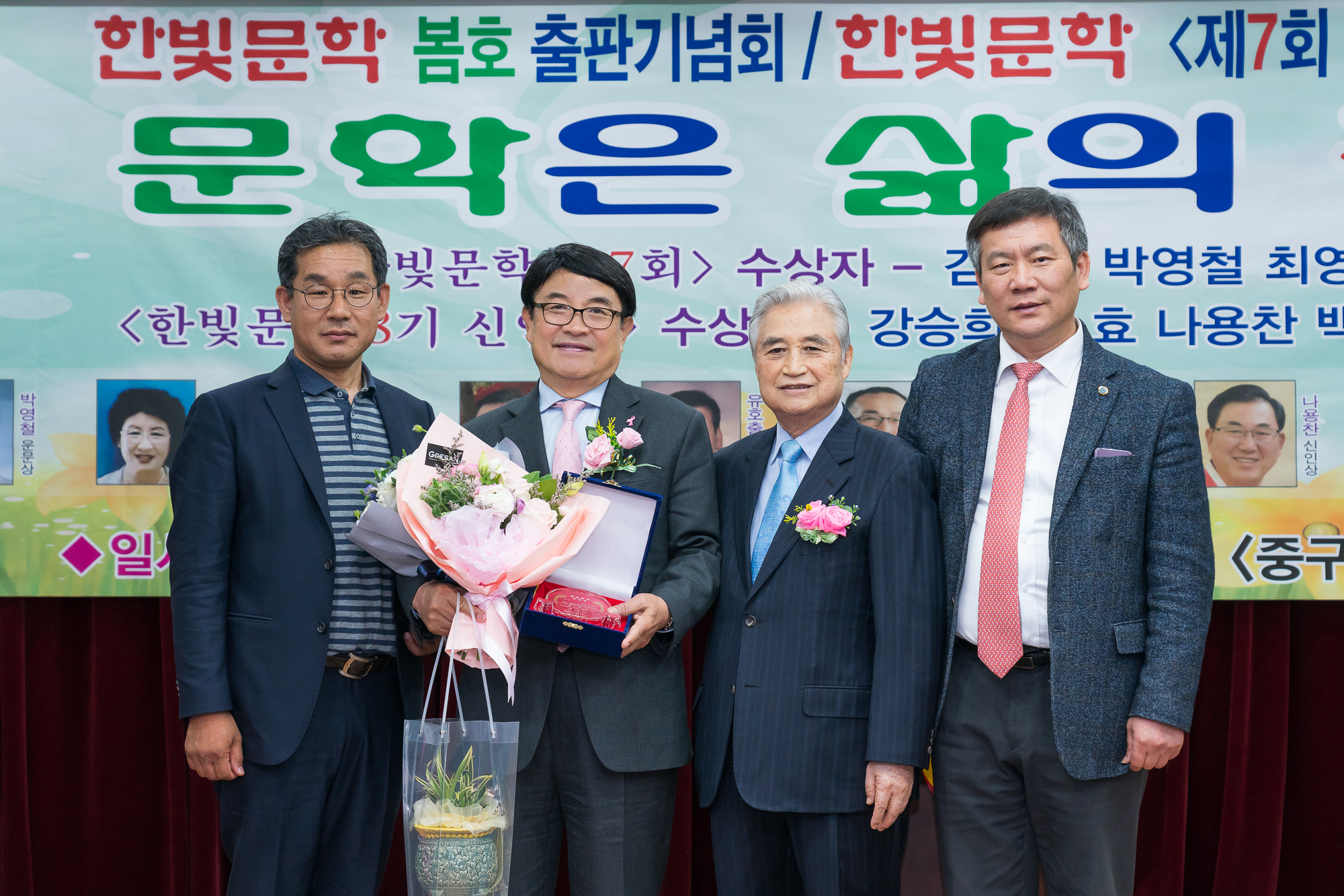 ▲ 이화여자대학교 의료원 백남선 이대여성암병원장이 지난 4월 12일 서울특별시 중구구민회관에서 개최된 제7회 한빛문학상 시상식에서 시(詩) 부문 신인상을 받았다.(사진 왼쪽에서 2번째가 백남선 원장)