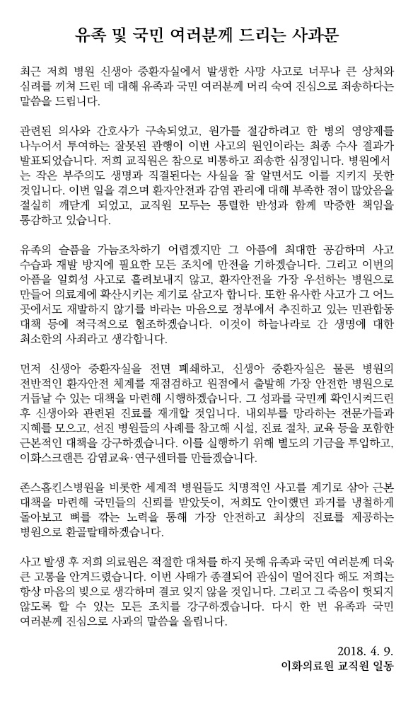 이대목동병원, 경찰 수사 마무리에 따라 사과와 개선 대책 발표