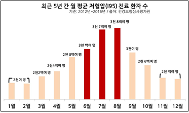 여름철이 되면 기온, 습도, 불쾌지수까지 모든 것이 높아지지만, 한 가지는 떨어질 수 있다. 바로 혈압이다. 높은 기온은 혈관을 확장시키고 더운 날씨로 쉴 새 없이 흐르는 땀은 혈액량을 감소시켜 혈압을 떨어뜨린다. 그래서 여름철의 고온다습한 날씨는 저혈압이 초래되기 쉬운 환경이다. 실제로 건강보험심사평가원(이하 심평원)에 따르면 최근 5년간 저혈압 환자는 여름(6월~8월) 사이에 가장 많이 병원에 방문하고 있는 것으로 드러났다.