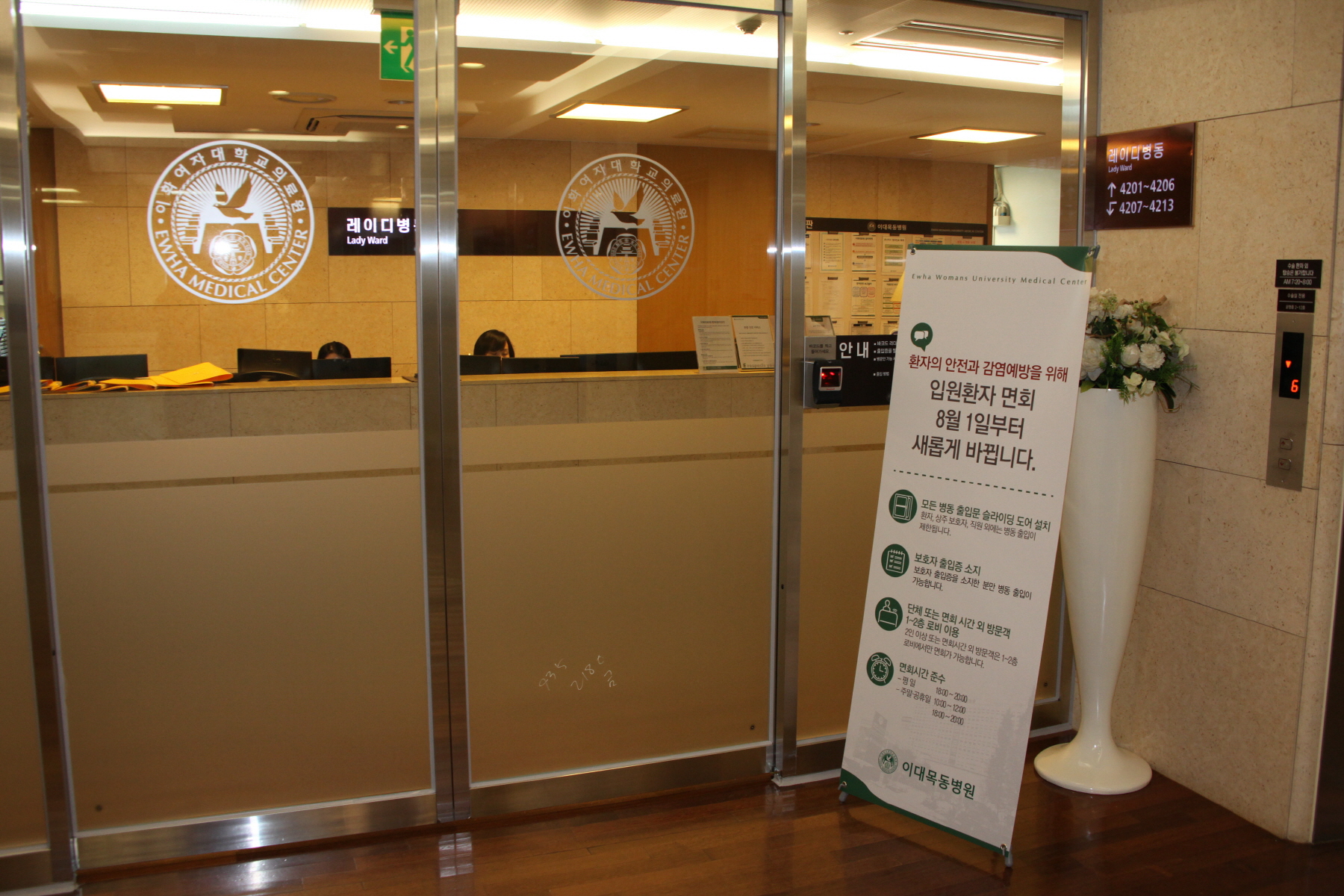 이대목동병원은 병문안객 통제 시스템 가동에 따라 병동 출입구 스크린 도어 설치는 물론, 24시간 병문안객 통제 업무를 담당할 보안요원도 대폭 증원해 배치했다. 이번 병문안객 통제 시스템 운영에 따라 정해진 시간 외 병문안 및 2인 이상 단체 병문안은 엄격히 제한되며 이 경우 본관 1층 로비를 이용하면 된다.