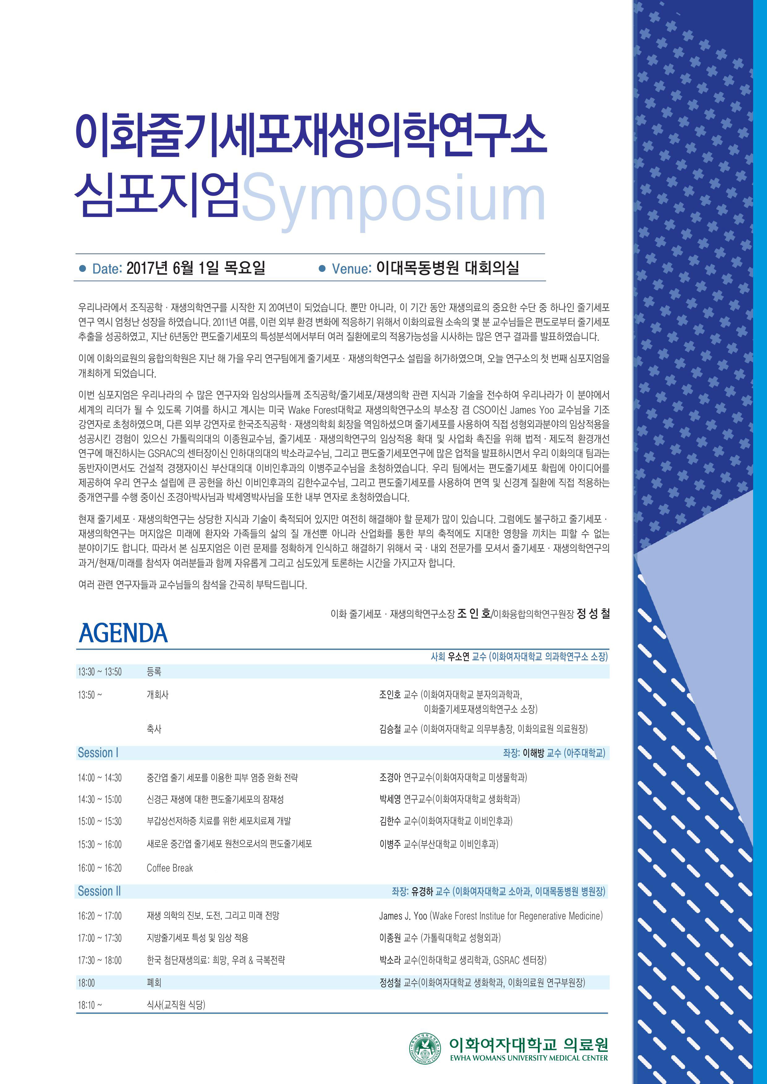 이화줄기세포재생의학연구소(소장: 조인호)는 오는 6월 1일 오후 1시 30분부터 6시까지 이대목동병원 2층 대회의실에서 줄기세포 심포지엄을 개최한다.