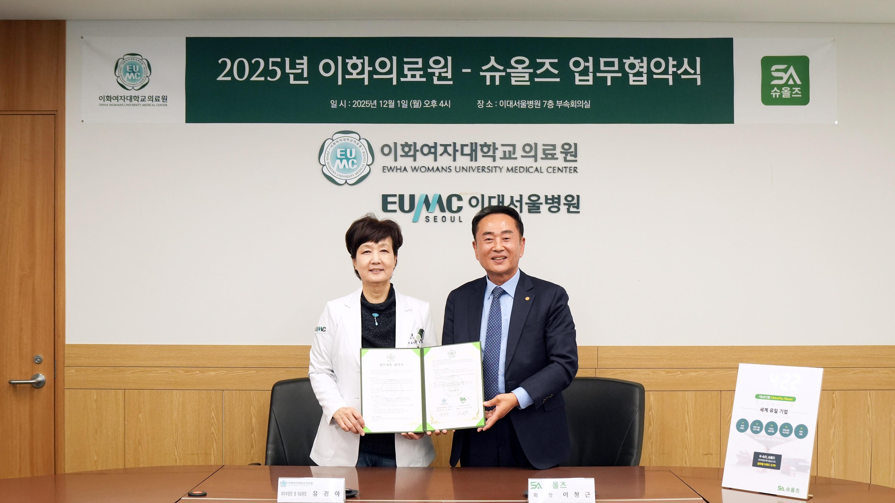 이화여자대학교 의료원(의료원장 유경하)이 기능성 신발 제조회사 슈올즈와 지난 1일 이대서울병원 7층 부속회의실에서 업무협약식을 개최했다.