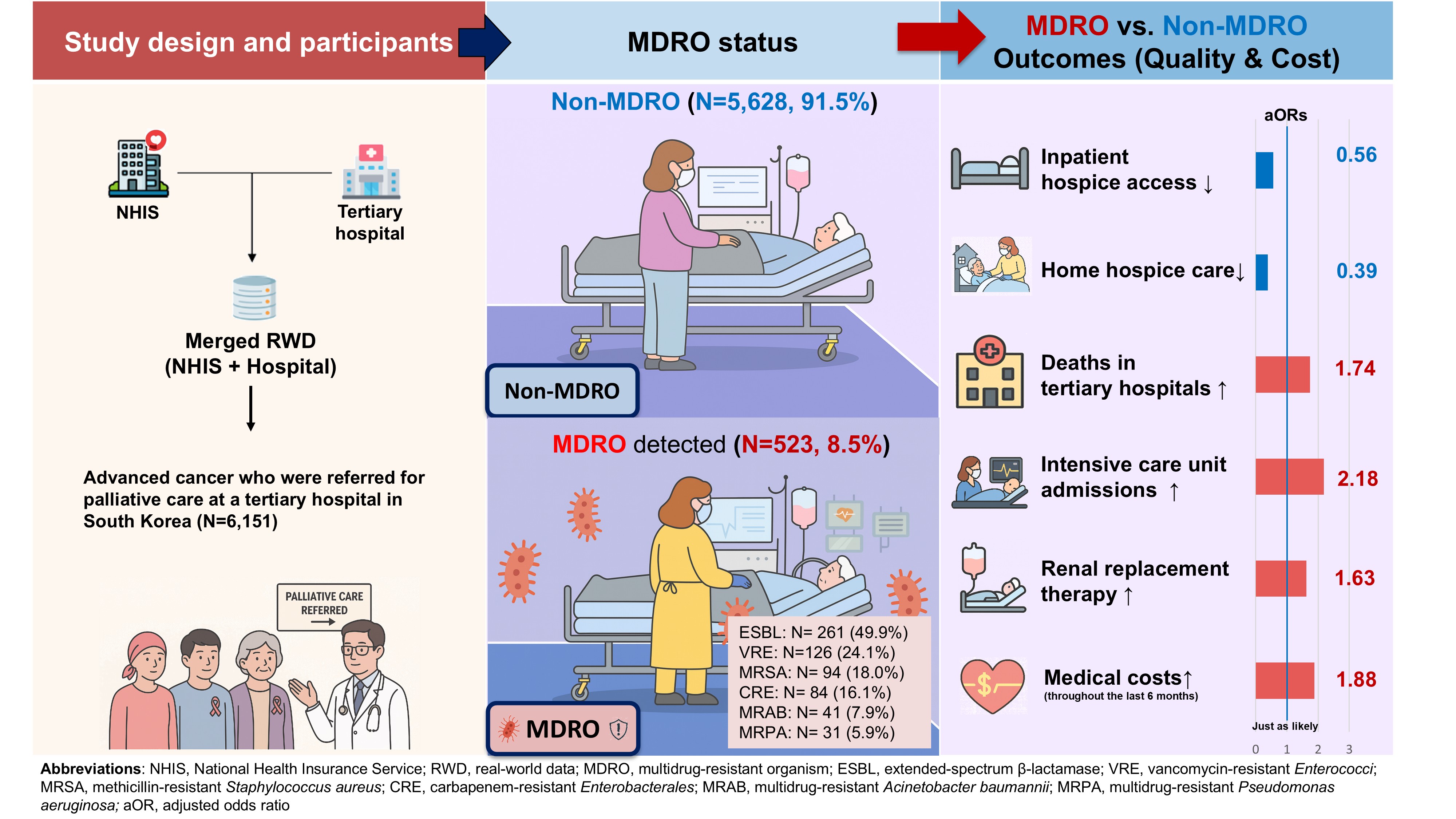 연구팀은 “이번 분석이 감염관리 정책과 다제내성균 관리가 말기 환자의 진료 경로와 생애말기 케어의 질에 어떤 영향을 주는지를 실증적으로 보여준 첫 연구”라며 말기 암환자의 삶의 궤적을 반영하는 환자 중심적 감염관리 전략의 필요성을 강조했다.