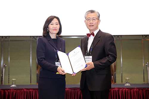 ▲ 이대목동병원 소화기내과 정성애 교수(사진 왼쪽)가 최근 개최된 대한소화기학회 추계 학술대회에서 ‘SK케미칼 생명과학 부문’ 연구비 1천만 원을 지원 받았다.