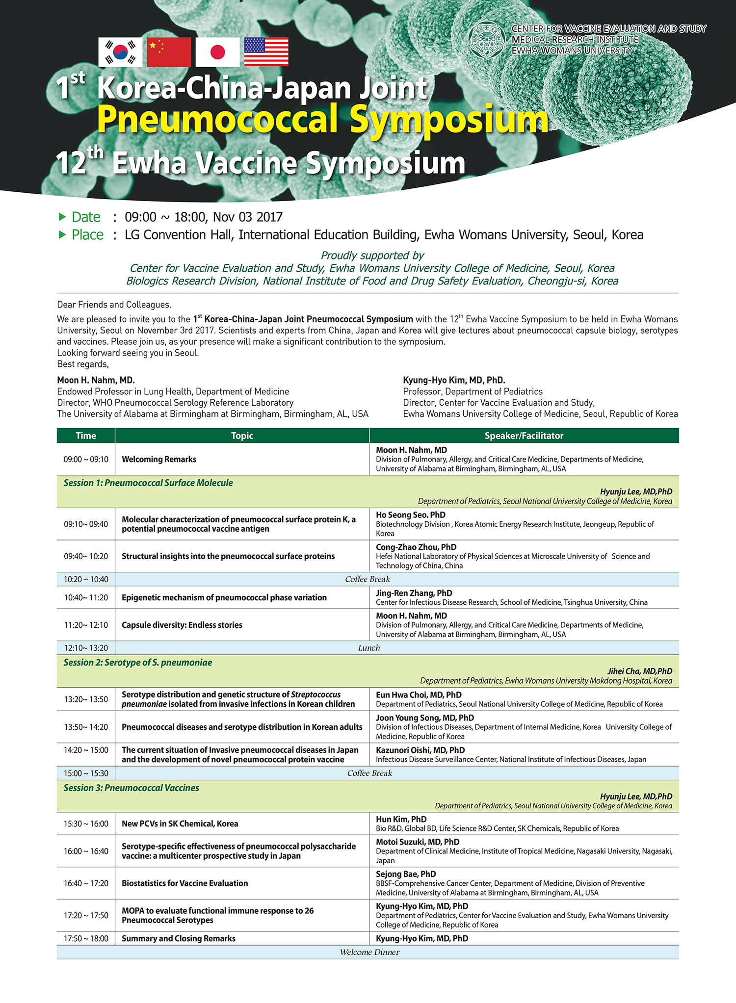 이화여자대학교 의과대학·의학전문대학원 이화백신효능연구센터(센터장 : 김경효)는 오는 11월 3일 오전 9시부터 오후 6시까지 이화여자대학교 국제교육관 LG컨벤션센터에서 ‘제1회 한·중·일 연합 폐렴구균 심포지엄'을 개최한다.