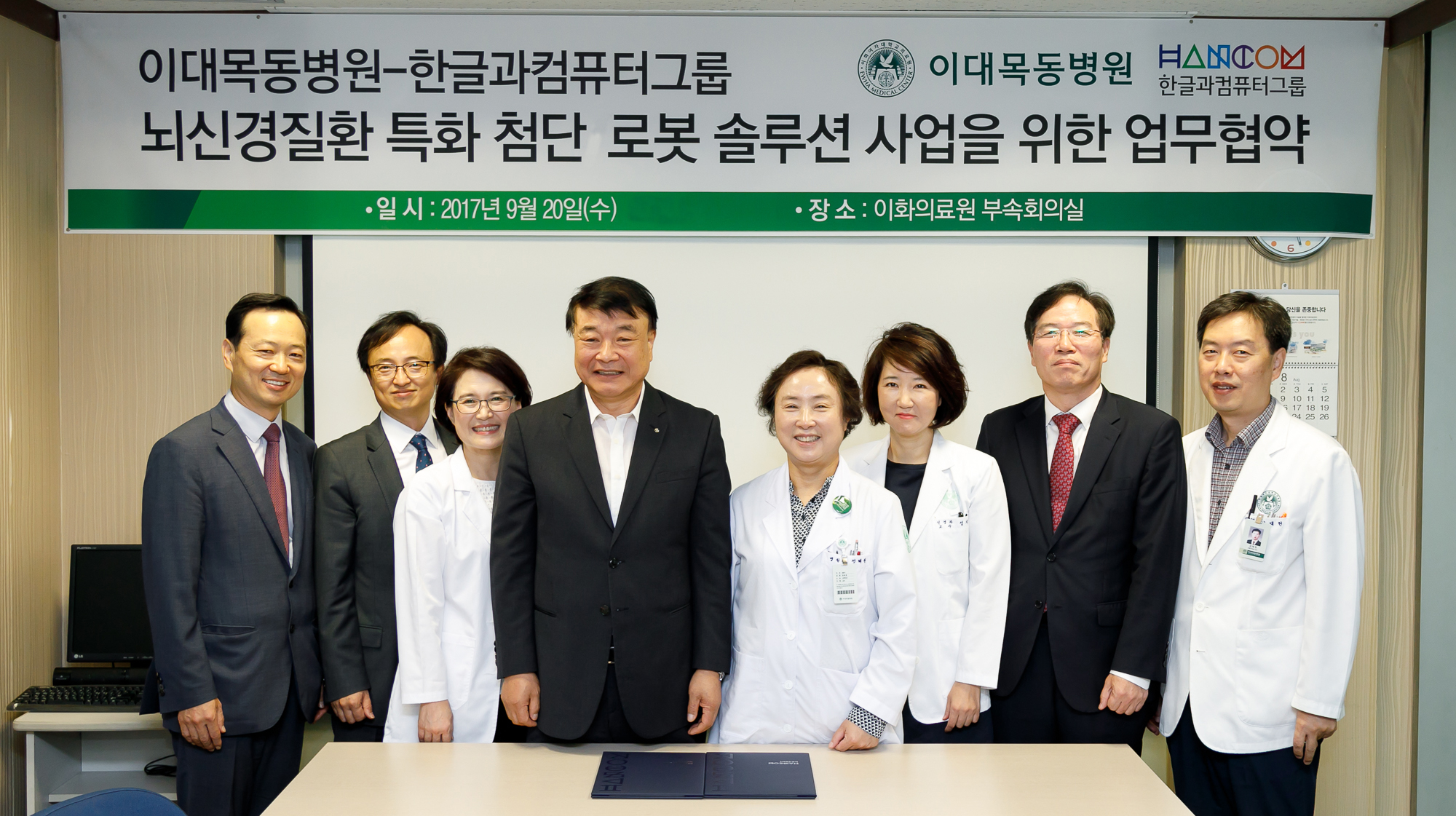 ▲ 9월 20일 개최된 이대목동병원과 한글과컴퓨터그룹 간 뇌신경질환 특화 첨단 로봇 솔루션 사업을 위한 업무 협약식에서 참석자들이 기념 촬영을 하고 있다(오른쪽에서 4번째가 정혜원 이대목동병원장, 5번째가 김상철 한글과컴퓨터그룹 회장).