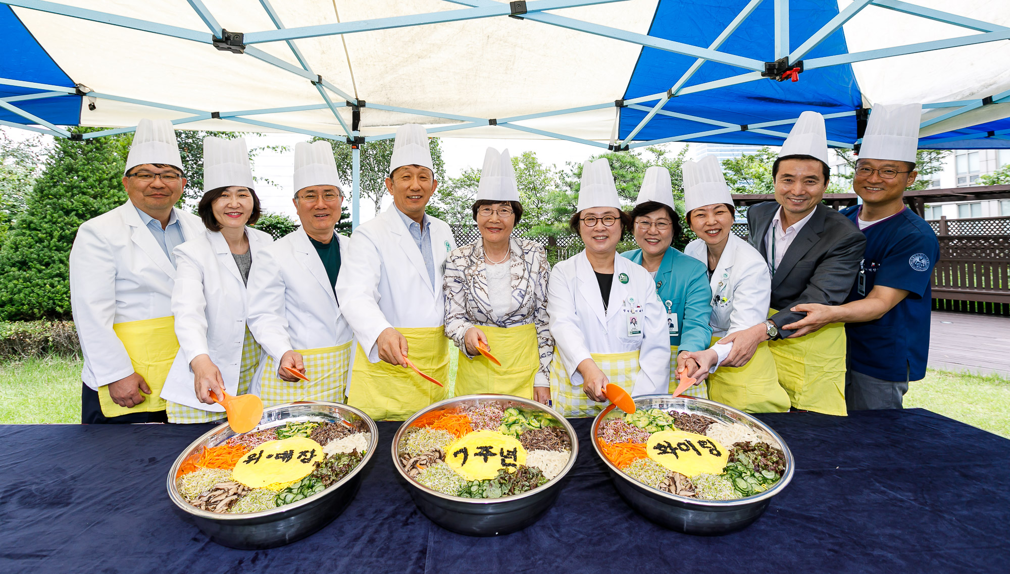 먼저 점심식사 시간에 병원 3층 이화쉼터에서 '건강 비빔밥 만들기' 행사를 개최했다. 의료진들은 이날 행사에서 평소 진료실에서의 근엄한 모습을 벗어 던지고 환우들과 함께 비빔밥을 만들었다.
