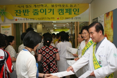 이번 캠페인은 먼저 병원 차원에서 급식 방법을 개선해 * 잔식이 많은 밥과 김치를 리필할 수 있는 추가 배식대 마련 * 음식량 선택할 수 있도록 대/소 구별 배식 * 매주 금요일을 ‘금다날(금요일은 다 먹는 날)’로 선정 *잔반 량을 스스로 측정해 볼 수 있는 ‘양심 저울’ 설치 * 1일 평균 잔반량 추이를 한눈에 알아볼 수 있는 도표 부착 등을 통해 직원들이 손쉽게 잔반을 줄일 수 있도록 했다.