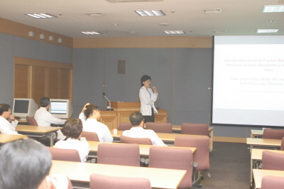 해외연수 교수 발표회 가져 이대목동병원(원장 서현숙)은 지난 10월 19일 오후 5시 대회의실에서 올 해 해외연수를 마치고 돌아온 교수들의 연수기간 중 연구 및 최신지견을 듣는 “해외연수교수발표회”를 개최했다. 이날 발표회에는 지난 1년간 해외연수를 마치고 돌아온 소아과 김혜순 교 수, 방사선과 강병철 교수, 외과 문병인 교수, 안과 임기환 교수가 동료교 수와 전공의를 대상으로 각각 발표를 진행했다. 해외연수 교수 발표회는 연구년을 받아 해외대학에서 연구활동을 하고 온 교수들의 그동안의 성과를 발표하는 시간으로 연구년을 준비하는 교 수에게는 소중한 경험을 나누고 전공의들에게는 해외의 최신지견을 함께 나눌 수 있는 자리라는 평가를 받고 있다. |