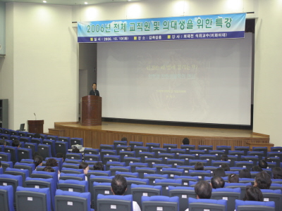 이대목동병원(원장 서현숙)은 지난 10월 13일(금) 오후 5시 전 교직원을 대상으로 의과대학 김옥길 홀에서 10여 년 간 열대를 누비며 동물행동학에 매진한 이화여대 생명과학과 최재천 석좌교수를 초빙 특강을 실시했다. . 이날 강의는 직원들이 병원과 의료계라는 좁은 시각에서 벗어나 좀더 큰 범주에서 생명을 바라 볼 수 있도록 『인간은 왜 병에 걸리는가? - 의학과 진화생물학의 만남』라는 주제로 진행되었다. 이날 특강에서는 그동안 각종 저서를 통해 진화생물학이 인간에게 던지는 화두에 대해 설파했던 최재천 석돠교수가 좌중을 사로잡는 특유의 어법으로 의료계 종사자들이 한번은 생각해봐야할 문제들에 대해 어려 과학적 사레를 제시하며 300여명의 교직원과 공감하며 시종일관 즐거운 시간이 이어졌다. 이대목동병원은 이번 특강에 이어 앞으로도 특정 분야를 막론하고 교직원들이 자신을 재 충전할 수 있는 시간으로 만들어 갈 수 있도록 이런 특강을 계속 마련할 예정이다. |
